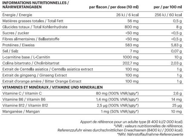 Tasakaalustatud aktiivsete koostisosade kombinatsioon toetab rasvade mobiliseerimist, energiavahetust ja vereringet, samas kui termogeensed omadused aitavad kehal säilitada loomulikku energiataset. L-karnitiin, oluline aminohape, osaleb rasvhapete transpordis rakkudesse, kus neid kasutatakse energia tootmiseks. Toode on meeldiva apelsinimaitsega, vegan ja ei sisalda lisatud suhkrut.